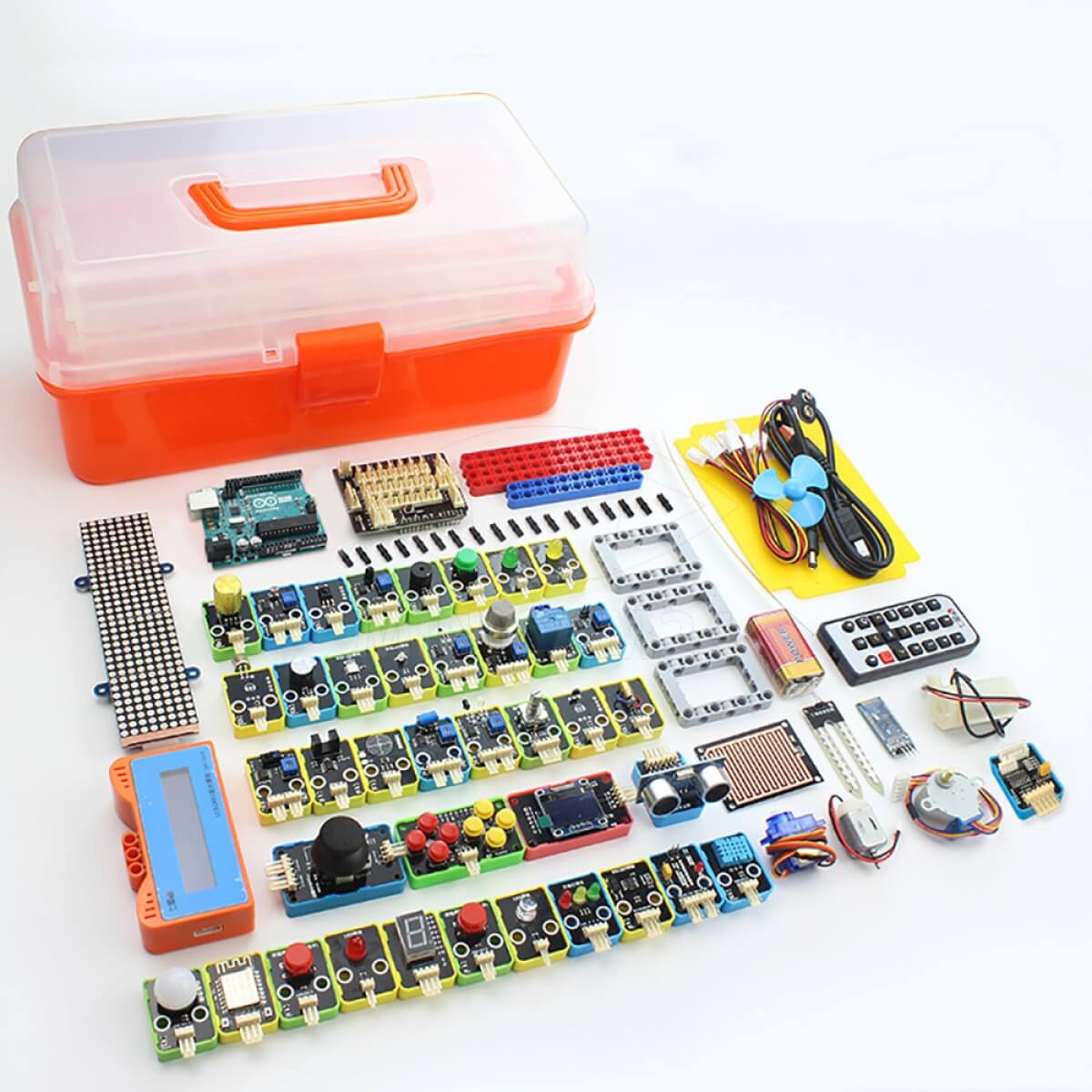 Набор для моделирования Ардуино (Arduino) Learning Kit, плата UNO R3 – это полноценный обучающий конструктор, который подойдет начинающим и опытным робототехникам. Электроника для начинающих включает в себя 40 модулей (платы, датчики, резисторы, расширители, кнопки, дисплеи, пульты управления), из которых можно реализовать 30 проектов. Опытные мастера на базе предложенных модулей могут собирать более сложные устройства, в том числе для управления домом. При необходимости набор для Arduino можно расширить путем докупки необходимых компонентов. Инструкция по сборке основных проектов и установки ПК на компьютер идет в комплекте.